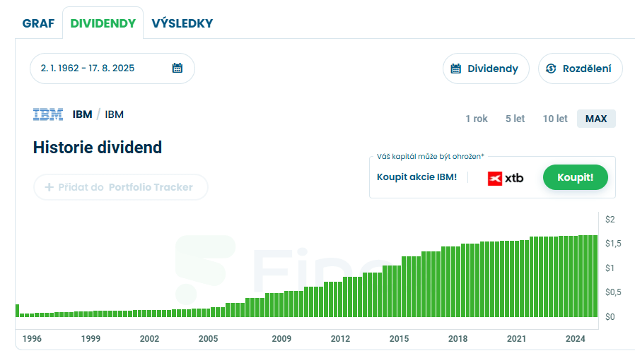 - Pre dividendových investorov, ktorí hľadajú stabilný príjem a spoľahlivú históriu zvyšovania dividend, môžu byť IBM akcie veľmi atraktívne. Spoločnosť si dlhodobo udržuje silný záväzok voči svojim akcionárom prostredníctvom dividendových výplat.