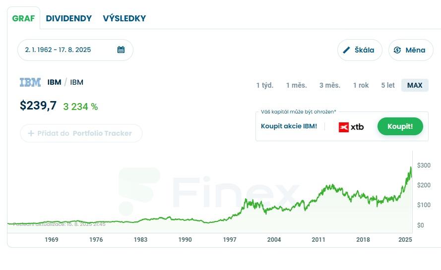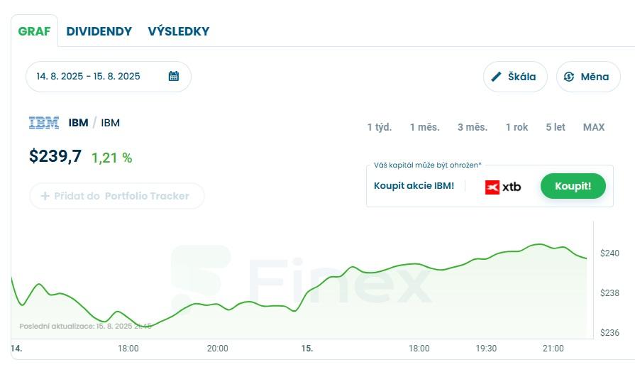 - K 15. augustu 2025 sa cena akcie IBM pohybovala na úrovni približne 239,71 USD.
