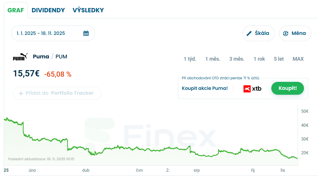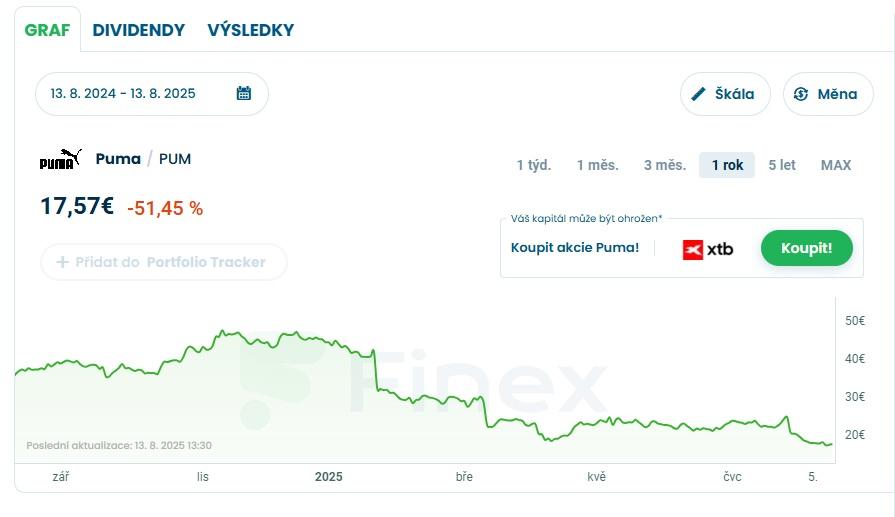 Na portáli Finex.cz bola cena akcie Puma (ticker PUM) zaznamenaná 13.8. 2025 v hodnote približne 17,42 €, čo predstavuje medzidňový nárast o 1,22 %. Trhová kapitalizácia spoločnosti bola ohodnotená na 2,56 miliardy €, pričom pomer cena-k zisku (P/E) dosahoval hodnotu 13,97. Dividendový výnos bol na úrovni 3,5 %, pričom ročná dividenda na akciu činila 0,61 €.
