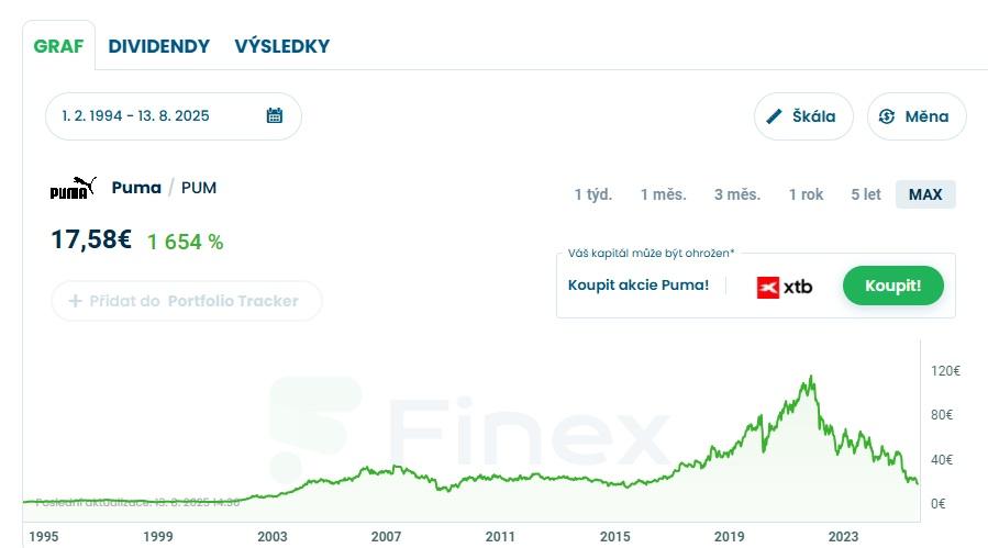 Graf zobrazuje vývoj ceny PUMA akcie (PUM) od 1. februára 1994 do 13. augusta 2025.