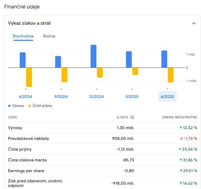 | EBITDA | -2,73 mld. USD | Prevádzkový zisk pred započítaním úrokov, daní, odpisov a amortizácie; negatívna hodnota poukazuje na stratu. |