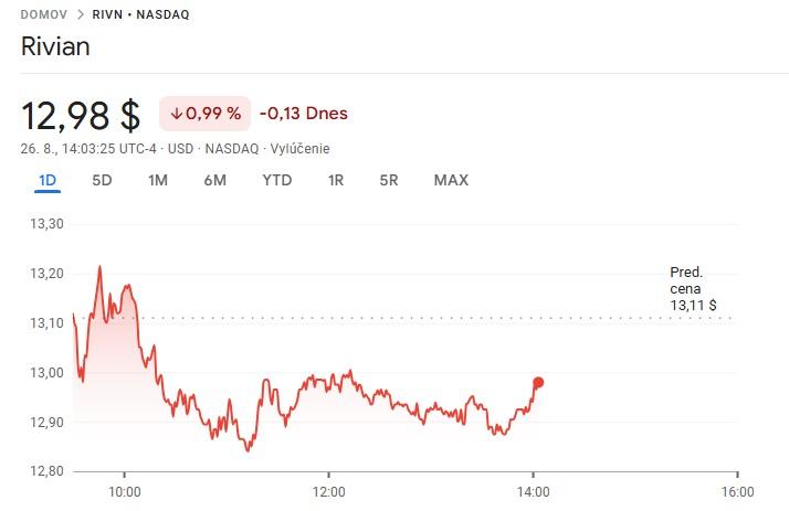 Akcie Rivian Automotive, Inc. (ticker RIVN) sa obchodovali na americkej burze NASDAQ za približne 13,18 USD ku 26.8. 2025. Denné rozpätie sa pohybovalo medzi 13,03 – 13,18 USD, pričom otváracia cena bola 13,11 USD. Objem obchodov je na úrovni približne 409 325 kusov. Ku dňu 15.12. 2025 sa akcie Rivian obchodovali za 18,42 USD.