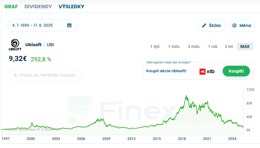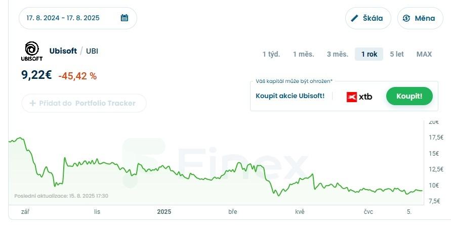 - Celkový trend: V priebehu posledného roka cena akcií Ubisoft výrazne klesla. V medziročnom porovnaní zaznamenala pokles o viac ako 45 %. Tento klesajúci trend je viditeľný aj v šesťmesačnom a ročnom grafe.