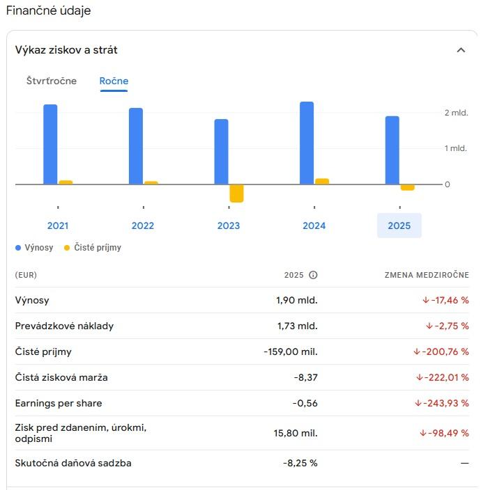- Zisk a tržby: Z finančných správ vyplýva, že spoločnosť v poslednom účtovnom roku (2024-2025) dosiahla tržby vo výške 1,85 miliardy eur, čo je pokles oproti predchádzajúcemu roku. Zároveň vykazuje stratu na akciu (EPS) za rok 2024-2025.