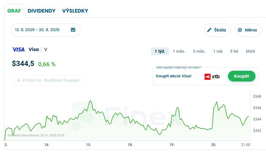 Napriek tomu sa akcie Visa historicky považujú za odolné a sú vyhľadávané pre ich potenciál dlhodobého rastu a schopnosť generovať stabilné príjmy pre investorov. Za posledných 52 týždňov sa cena akcií pohybovala od 265,31 $ do 375,51 $ (údaj z 20.8.2025).