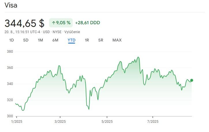 Na základe grafu akcií Visa (V) na burze NYSE možno vidieť celkový rastový trend ceny akcií spoločnosti Visa od začiatku roka 2025 do dnešného dňa.